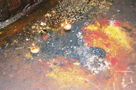 ミナークシ寺院の床に伏して祈るヒンドゥー教徒(2.Jan.2003.@Madurai)