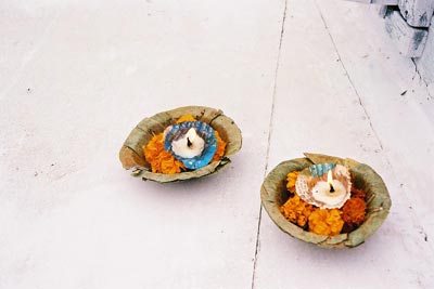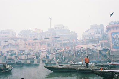 ガンガーを航行するボートの渡し場までは物売りに行く手を阻まれる。インドでは当たり前のことだ。難儀してボートに乗ると、売り子が祈りをささげるための精霊流しのような花飾りを売りに来る。1個5ルピー(15円弱)。売り子がロウソクに灯をともしてくれる。