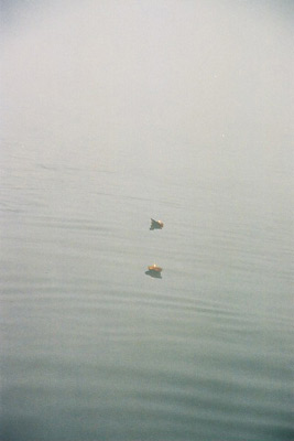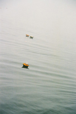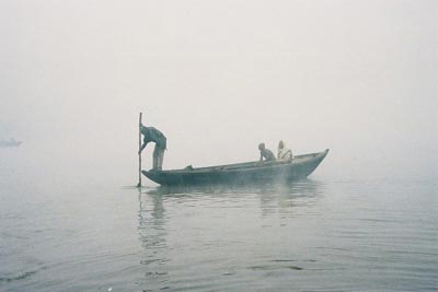 霧に包まれた川面に浮かぶ一艘の幻のような船。インド人の老夫婦が乗っているようだ。彼らは聖なるガンガー何を祈るのか。