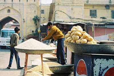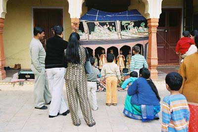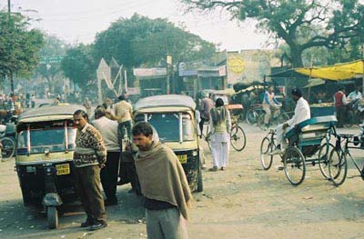 インドの日常。街は活気がある。食べモノを売る者、集まって話をする者などでにぎやかだ。狭い道路にはオート三輪のタクシー、リクシャ、自転車が、車や人の合間をすり抜けて走る。人形劇などもやっている。
