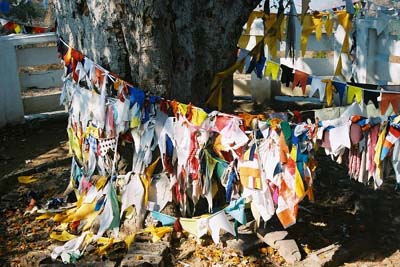 サーンチーも仏教遺跡で有名。観光客が訪れる仏教遺跡群の片隅に、チベット仏教の信者達が祈りをささげる場所があった。タルチョ(チベット仏教で使われる生地)が、巨木の周りにはられた縄につり下げられている。チベットではおなじみの光景だが、インドでは珍しいのではないか。(1/3/04, サンチー) |