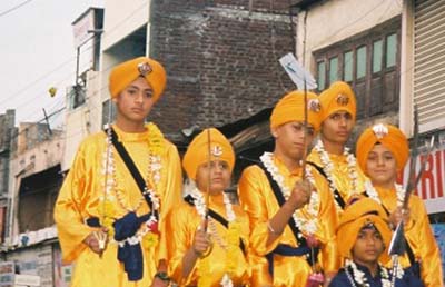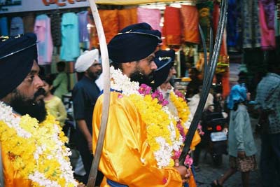 パレードに花を添える、盛装したシーク教徒の少年。剣をもって凛々しい。(1/5/04,オーランガバード)