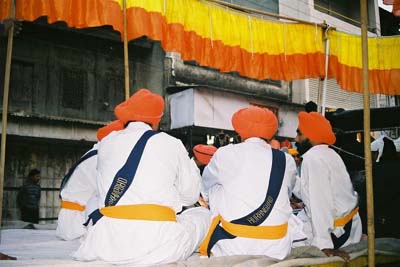 真言か説教をマイクで叫ぶ集団。全員が後向きに座っているため、何を見ているのかわからない。(1/5/04,オーランガバード)