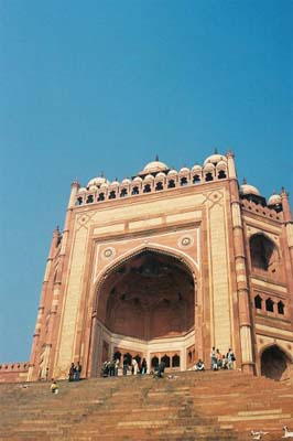 アグラから南西39キロにファイティプールシクリーはある。世継ぎに恵まれないムガール皇帝アクバルが、この地(現=ファイティプールシクリー)の預言者に従い、男子を授かったことを記念して、遷都した。ファイティプールシクリーとは、「勝利の都」という意味。アクバルはイスラムにとどまらず、インドの諸宗教の融和を図った。だから、この時代(16世紀)、インドの古代的建築様式とイスラム様式の融合が進んだ。(12/30/03) |