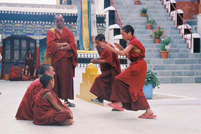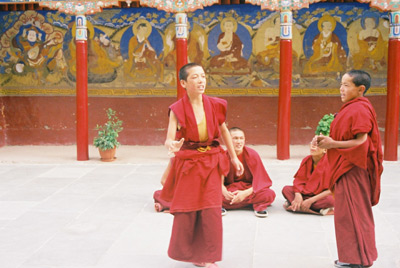 先輩僧侶の指導の下、問答形式の修行を行っている。