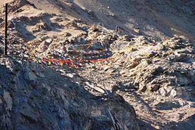 チベット仏教の世界(タルチョ)(2004/07/27.旧レー王宮付近) タルチョと呼ばれる祈祷旗。旗には経文が印刷されている。