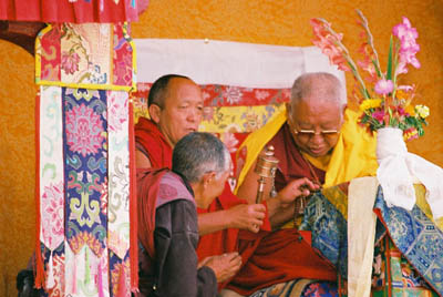 チベット仏教の世界〜マニコルタクトクツェチュ祭の前、高僧に祈りを捧げる信者。(2004/07/28.タクトクゴンパ)