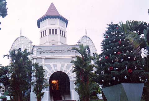 | 宿泊したグッドウッドパークホテル。オーチャードロード西側スコットロードにある。中心地に近いにもかかわらず、低層で落ち着いた雰囲気のホテルである。とんがり屋根はドイツライン川沿いのお城のイメージだとか。 |