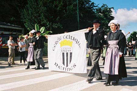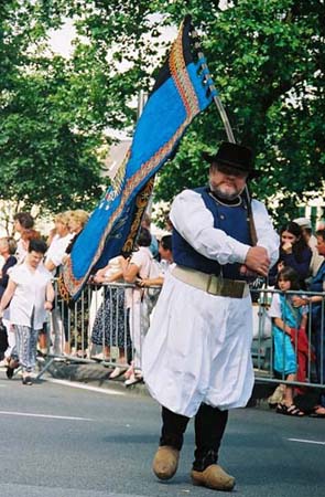 地域を表わす旗がパレードの先頭を行く