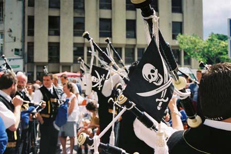 海賊のマークをつけたバンド(笛、バグパイプ、ドラムの構成)
